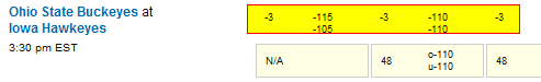 Also, I’m not sure why there are two sets of numbers, but going by the first set, Iowa was also the cheaper bet. To bet on Ohio State, you would have had to bet $115 to win $100, verus $105 to win $100 on Iowa.