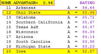 @Eric - No, I think It added correctly. Iowa was the home team, so the 2.94 home field advantage would offset OSU’s Sagarin advantage. Had the game been played in Columbus, it would have have been a 6 point advantage.