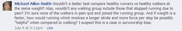 I get how running is better than sitting on your ass. I don’t get how running could be “neutral or helpful” when compared to walking. I believe that most people who choose walking over running are also consciously following a healthy path are doing so because they feel worse when they run. They self-exclude. Those who feel great running continue to run.