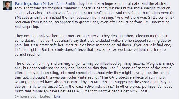 @James - “Maybe people who decide to run instead of walk are more likely to engage in other behaviors that may impact OA risk. ” — well said!