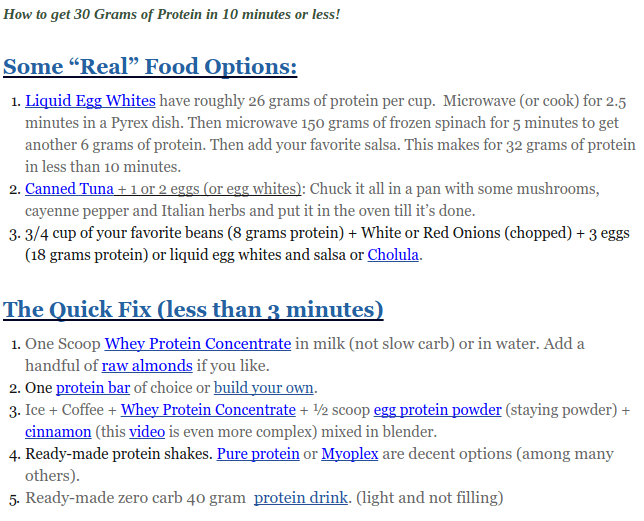 By starting the day off with a high dose of protein, Ferriss has found that it has an appetite suppressing effect which results in an easier path to fat loss. 4HourLife has some ideas on how to get those 30 grams. For me, even though I think whey protein is the one of most hyped overrated supplements, I bought some to make this experiment easier.
