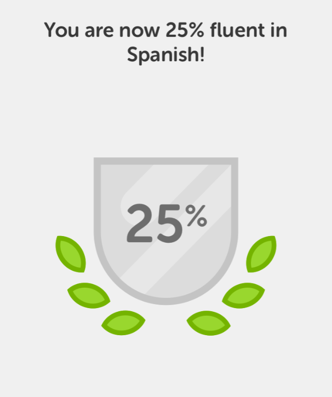 NOTE: Whenever I’ve earned a new milestone fluency level, Duolingo will immediately drop me back down 1-3%. Then I need to re-earn the levels again and ultimately reach a higher fluency score. I find this discouraging, but at least be aware they are doing this.