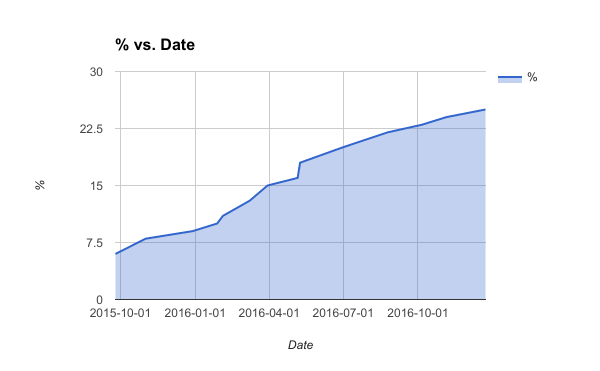 My first fluency estimate came in at 6% on September 5, 2015, which was 143 days after starting. It may have been a new feature then, so I’m not sure if it really took me that many days to reach 6%.