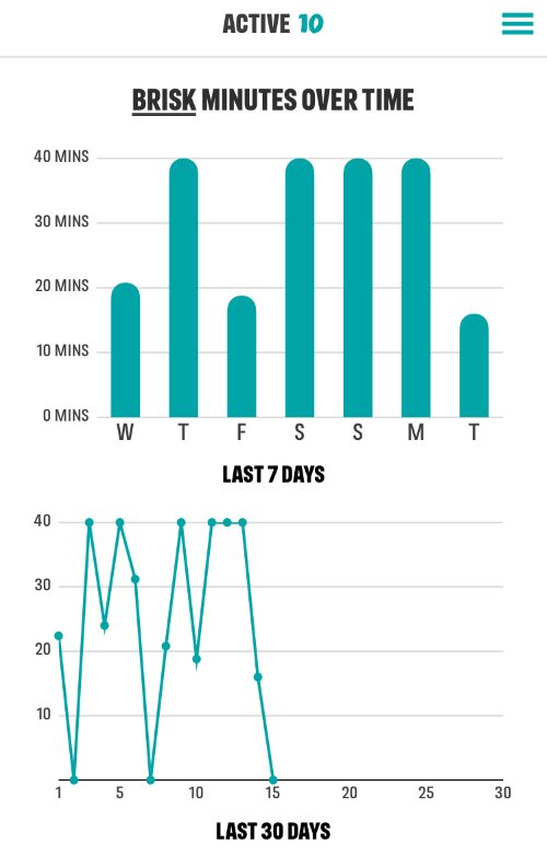 The app gives credit for minutes of brisk walking and blocks of 10-minute brisk walking. You can make the minutes easily without making the 3-blocks.