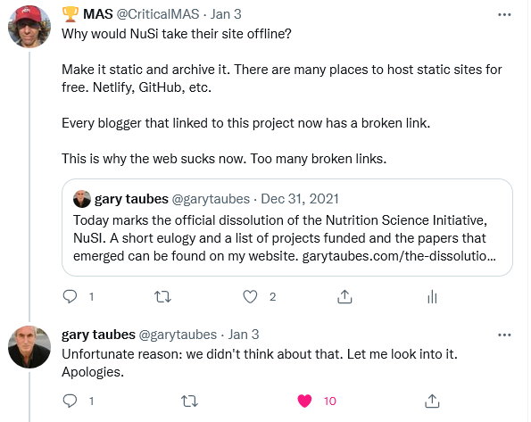 One of my favorite health bloggers throughout the years has been Matt Stone of 180DegreeHealth. For just over a month the site has been offline (403 error). I reached out to Matt on December 22 to inform him the site was down and he responded they were working on it. It is still down. WordPress is a bloated mess, but it is not rocket science. If it isn’t back up by this weekend, I’ll need to go through all my broken links and clean up those posts. It would be tragic if 180DegreeHealth ended up in the Digital Graveyard.