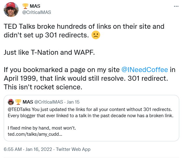 A few days ago, Ted Talks changed the links on all their content without adding a 301 redirect. I brought this to their attention and was ignored.