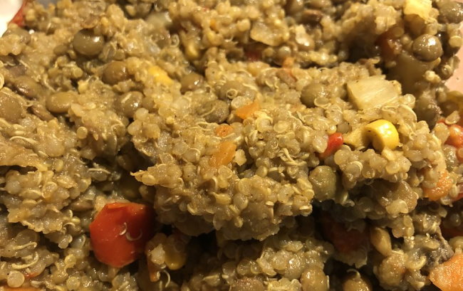 Yesterday for lunch I mixed lentils with quinoa and added some broth. Then I chopped some veggies and mushrooms up and tossed them into the mix. I set the Instant Pot to 5 minutes at high pressure. Then I added some sprouts, spices, and hot sauce. I had enough for 4 meals. My estimate is that each meal was about $2.