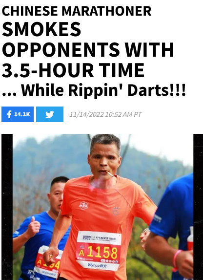 From Chinese Marathoner Smokes Opponents With 3.5-Hour Time … While Rippin’ Darts!!!